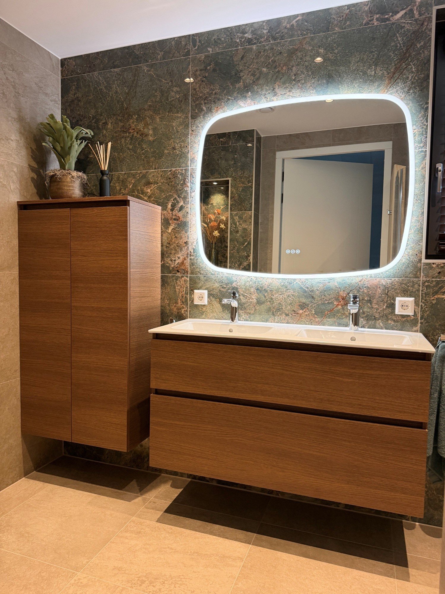 - een ruim badmeubel met hoge dubbele kast in warm hout